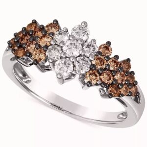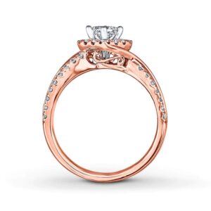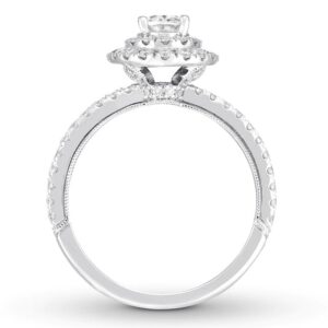 Breathtaking round diamonds surround a cushion-cut diamond in this romantic engagement ring. The 14K white gold band is awash with additional round diamonds for a dramatic effect. The ring has a total diamond weight of 2 1/6 carats.