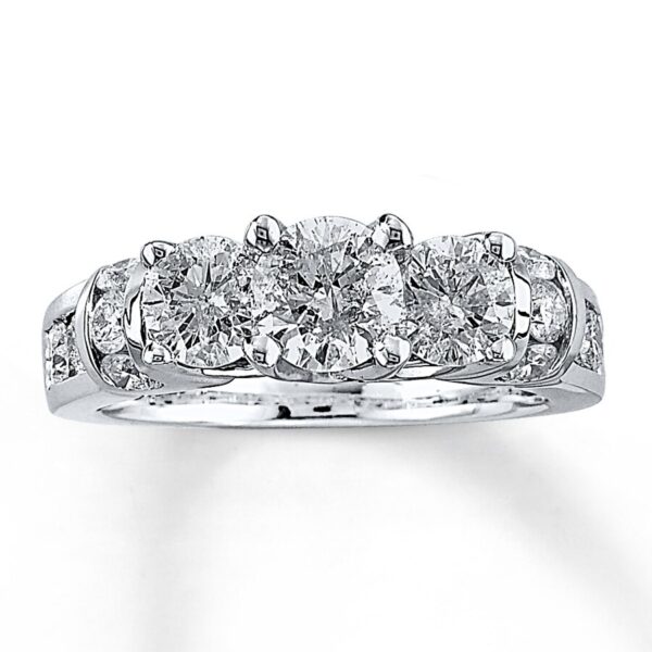 Three round diamonds command attention in the center of this unforgettable ring for her. Additional round diamonds dance on either side for added dazzle. The ring, styled in 14K white gold, has a total diamond weight of 2 1/2 carats. Available online while supplies last. Previously Owned Treasures are not eligible for in-store pick-up. Previously Owned Treasures may only be shipped either to your home address or to an alternate address.