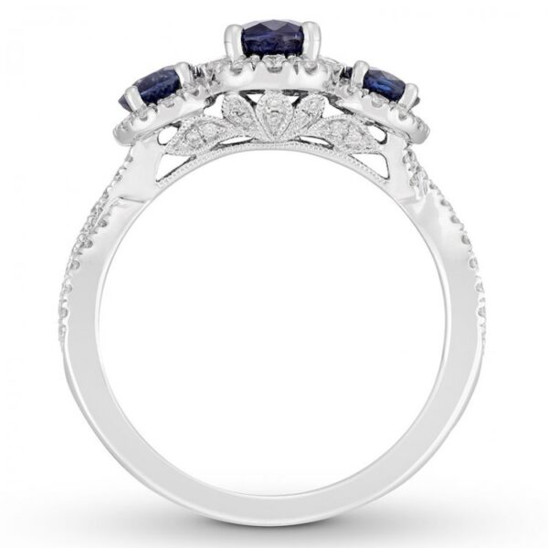 Inspired by vintage designs, this stunning engagement ring offers a captivating take on the traditional three-stone design. Three oval natural sapphires capture attention in the center, while frames of round diamonds add brilliance to complement. More sparkling round diamonds adorn the band to complete the glamorous design. Crafted of 14K white gold, the ring has a total diamond weight of 1/2 carat.